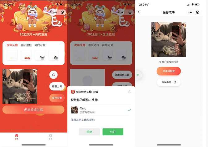 给大家带来一款以2022虎年为主的一款头像制作小程序源码内包含了虎年虎娃多种分类头像框模板,全是和2022虎年有关每一种分类都包含了多种模板制作另外整个小程序的背景UI都是以虎年为背景,所以总体的感觉还是很不错!